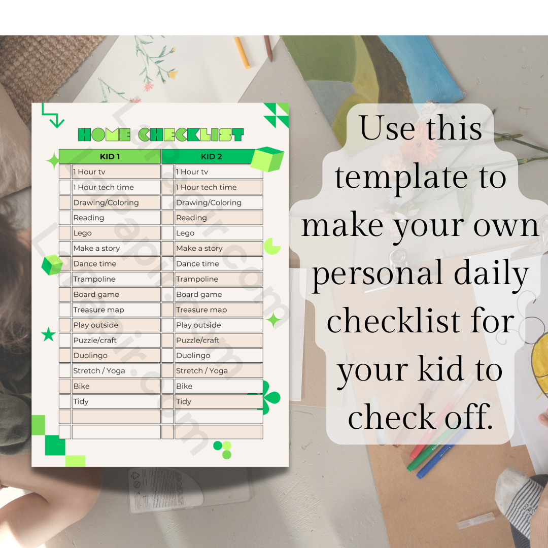 Denne malen gir deg mulighet til å tilpasse din helt egen liste for barna dine. Dette gir dem oversikt over hva som kan gjøres eller må gjøres i løpet av en dag.